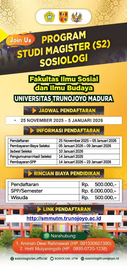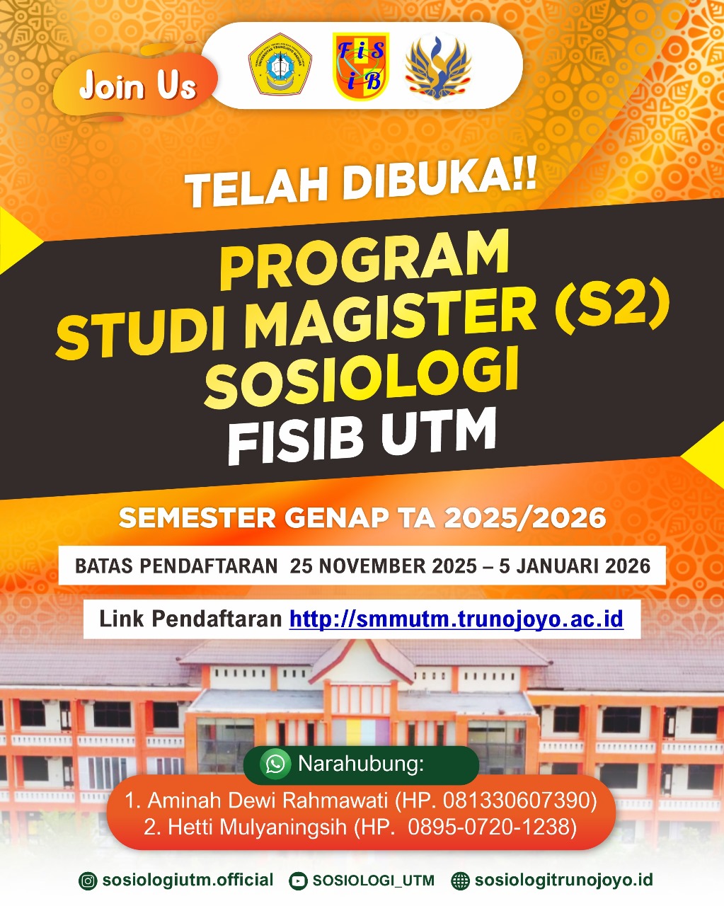Kamu bisa langsung menuju FISIB atau Sosiologi di kampus UTM untuk informasi lebih lanjut.